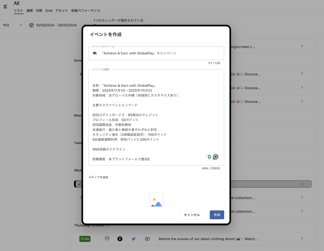 コンテンツの発案は、業界のニュースや自社プレスリリース、新製品の発表などイベントや伝えたいメッセージから発生しますが、このやりとりからメールやExcelを使わずに、Statusbrewでは「イベントとタスク」の告知機能でコミュニケーションを開始します。