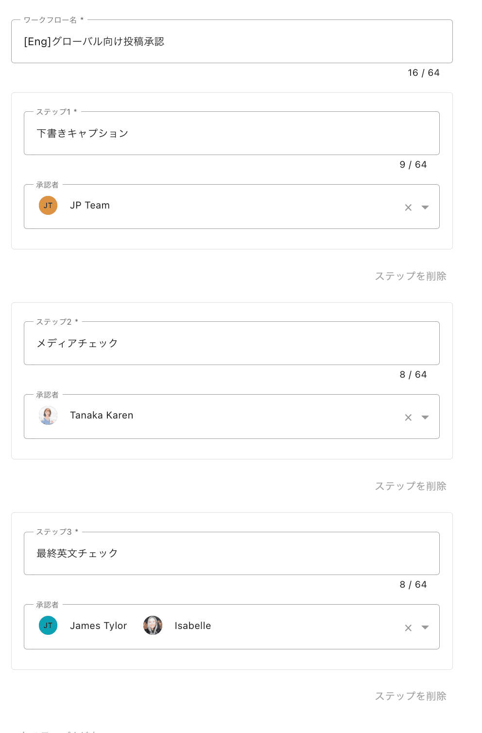 各SNSアカウントごとに、異なる承認ワークフローを設定します。
