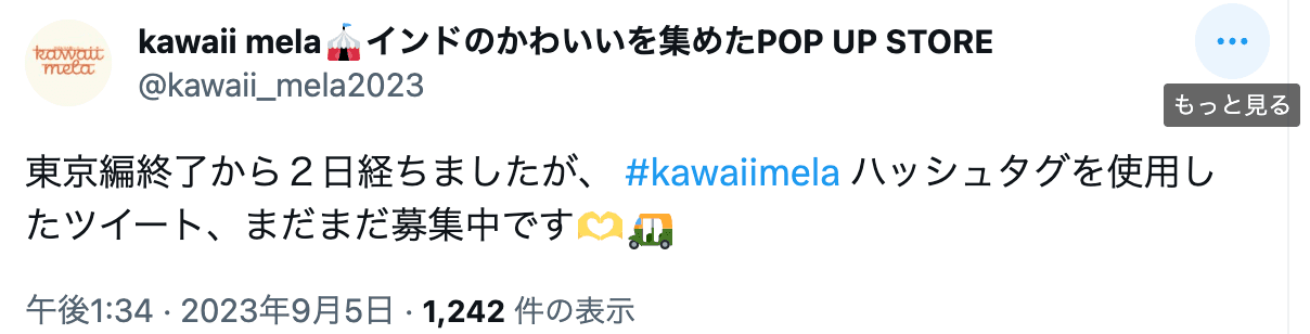 ・ ポップアップイベントの日程、場所、参加ブランド(今回の場合はkawaii mela)の確認。 ・イベントの公式ページやソーシャルメディアでの情報収集。 ・ イベントへの参加意向を友人や家族と共有。→Twitterでのツイート