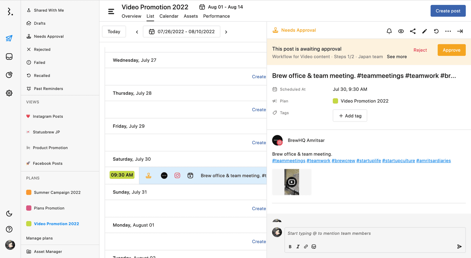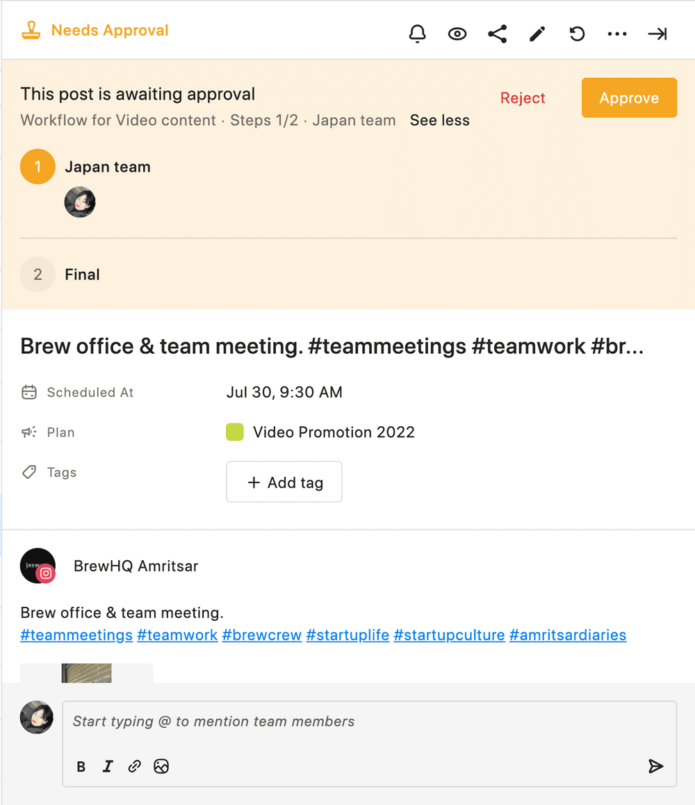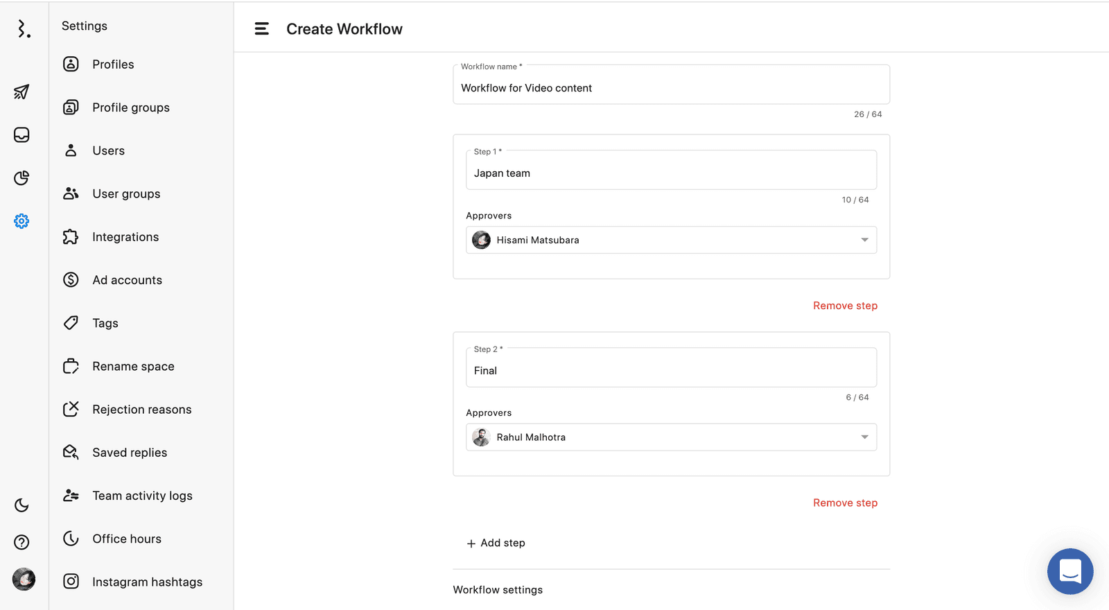リール投稿を動画コンテンツとして厳しいチェックを行う場合、カスタムで2段階、3段階の承認フローを作成することができます。