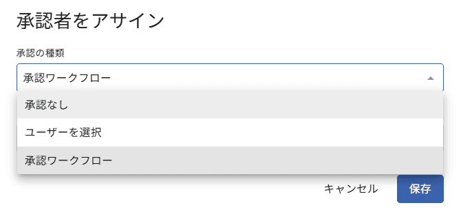 ・承認なし ・特定のユーザーを承認者として選択 ・あらかじめ作成しておいた承認ワークフロー の中から選択ができます。