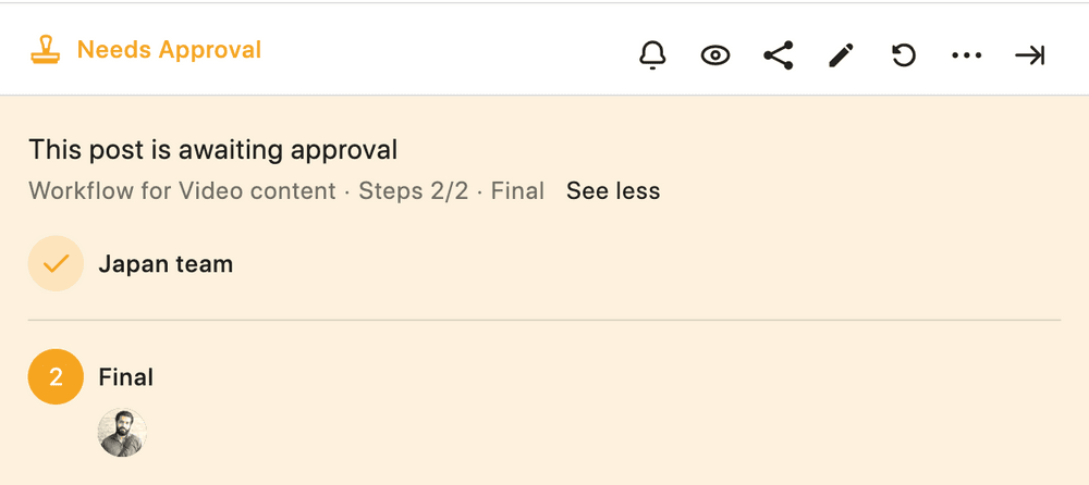 自分が承認者となっている投稿をクリックして詳細画面を開くと、投稿の承認待ちとして背景がクリーム色のセクションが表示されます。