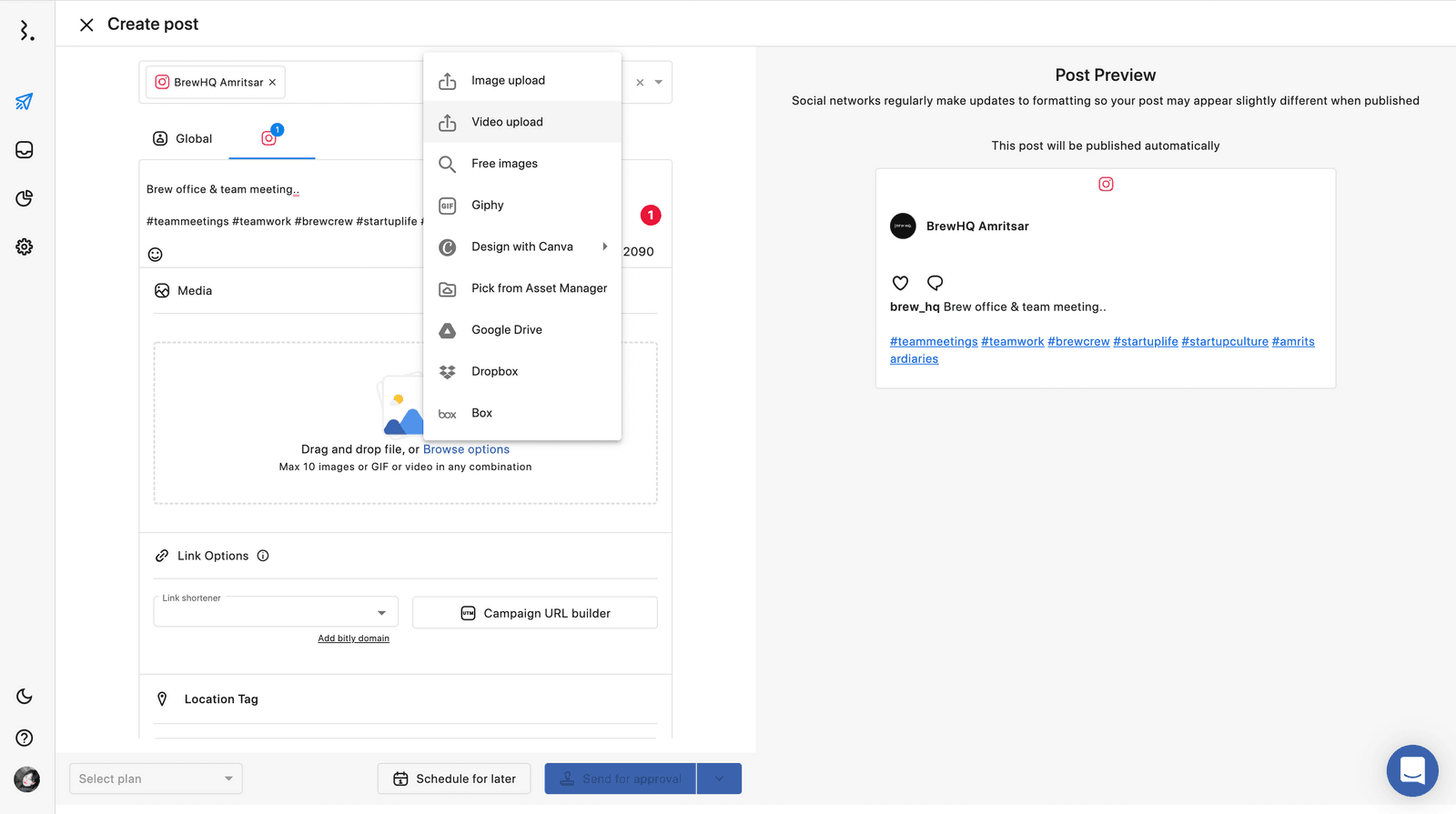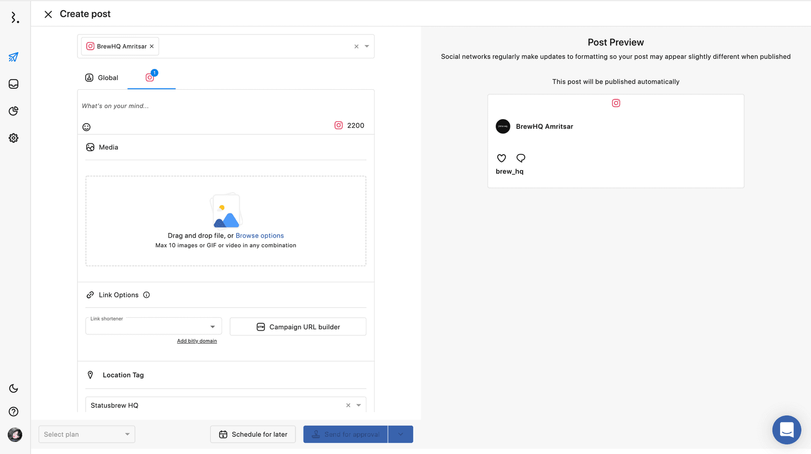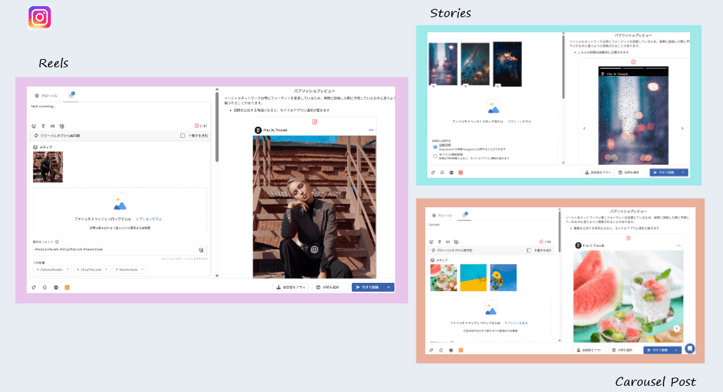 私たちStatusbrewはインスタグラムのリール、カルーセル、ストーリーズ(条件あり)の予約投稿に対応した、投稿・エンゲージメント管理ツールです。どの種類のコンテンツも手軽で素早く、コンポーズ画面より予約投稿することができます。