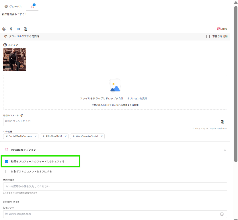 他にも、下記のオプションがあります。 ・位置情報(ロケーションタグ)の追加 ・ハッシュタグを30個まで設置するための「最初のコメント」の入力 ・対象ポストのコメントをオフに設定 ・共同投稿者の追加(最大3名) ・ユーザーをタグ付け ・モバイル通知を送るユーザーを選択 ・社内タイトル ・カスタムデータ属性(属性を自由に定義して、タグよりも更に細かなフィルタリングを実現)の追加 ・ウォッチャーの追加