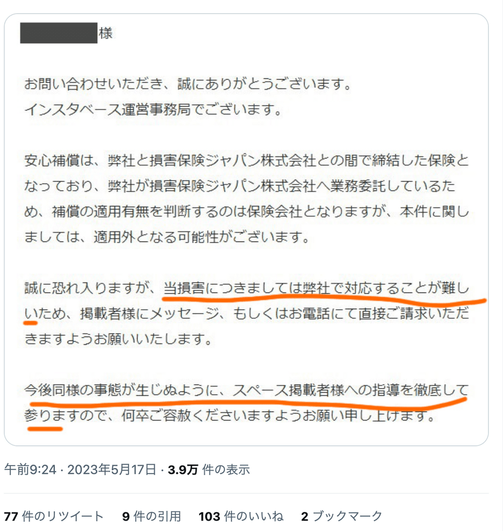 以下は、レンタルスペースを貸出している企業が、企業の手違いでダブルブッキングしてしまい、使用できなくなった際の対応メールです。丁寧な言葉で記されていますが、内容としては何の補償もしない不適切な対応です。例外的な状況では、より早急な返信時間はもちろんのこと、適切な対応をできるよう、より慎重にかつ素早くできるよう徹底しなければいけません。