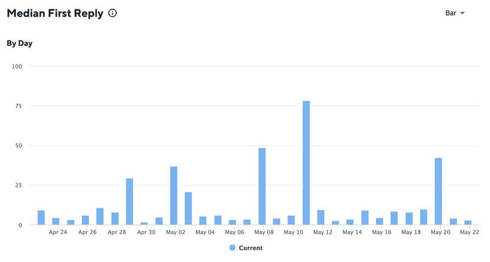 平均初回応答時間は、お客様がチケットを発行してから(例えばTwitterでDMを送信してから)、サポートチームが最初の応答をするまでの時間を記録します。初回回答時間は、お客様が回答を得るまでに待たされた時間を示すことで、サポートチームの効率を測定します。初動時間が短いほど、お客様に好印象を与えることができ、お客様の満足度が高くなります。平均初動時間は、初動時間の合計をチケットの数で割ることで算出できます。