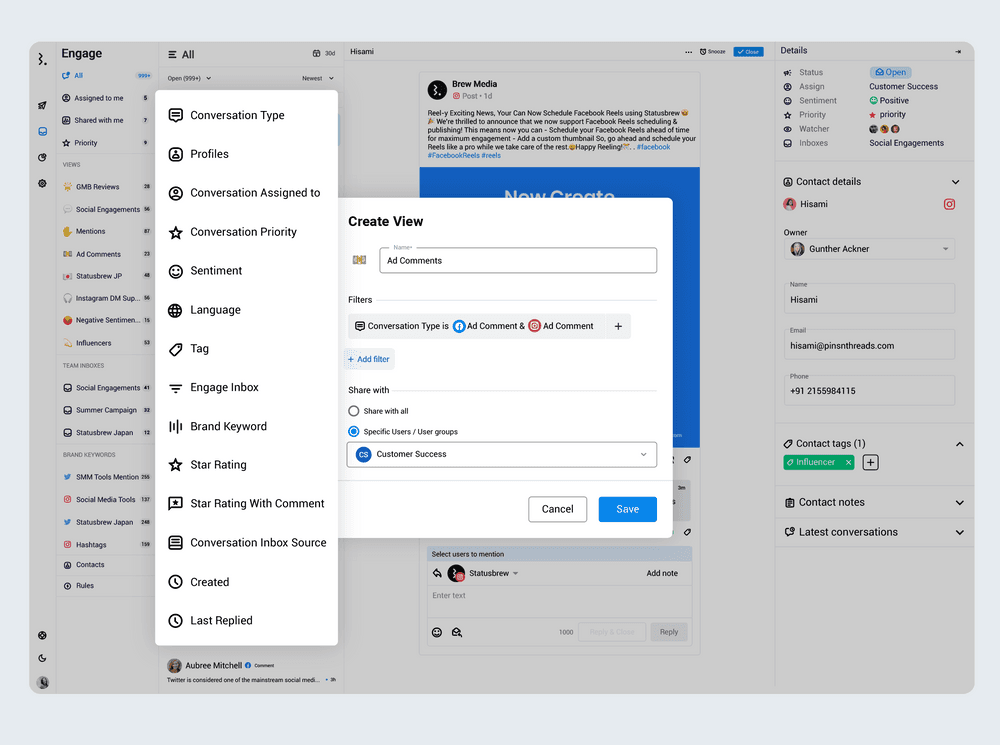 Statusbrewの180以上のレポート指標により、ユーザーはソーシャルメディアでのカスタマーサービスの取り組みの影響を分析することができます。