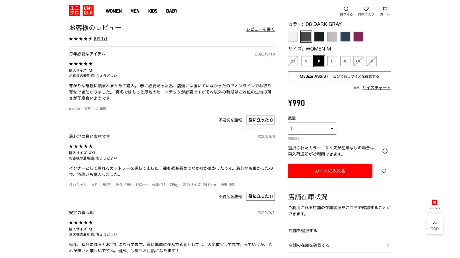 ユニクロの 「ヒートテック」 の商品ページに設置されているレビューセクション