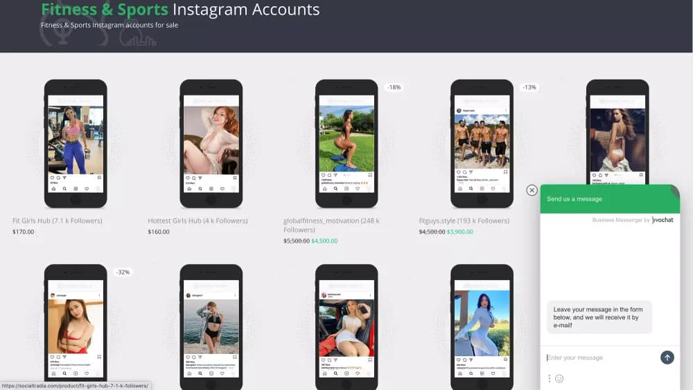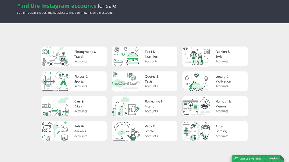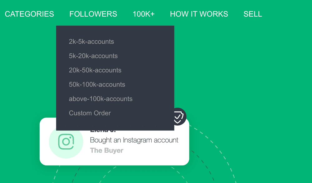 ウェブサイトでは、ユーザーがサイトの手数料をスキップして直接売り手のところに行くことができないように、Instagramのアカウントはユーザー名が伏せられた状態で掲載されていることがほとんどです。アカウントのニッチ(旅行系、金融系、ファッション系)だけでなく、フォロワー数とフィード投稿上のエンゲージメントの平均数が記載されています。