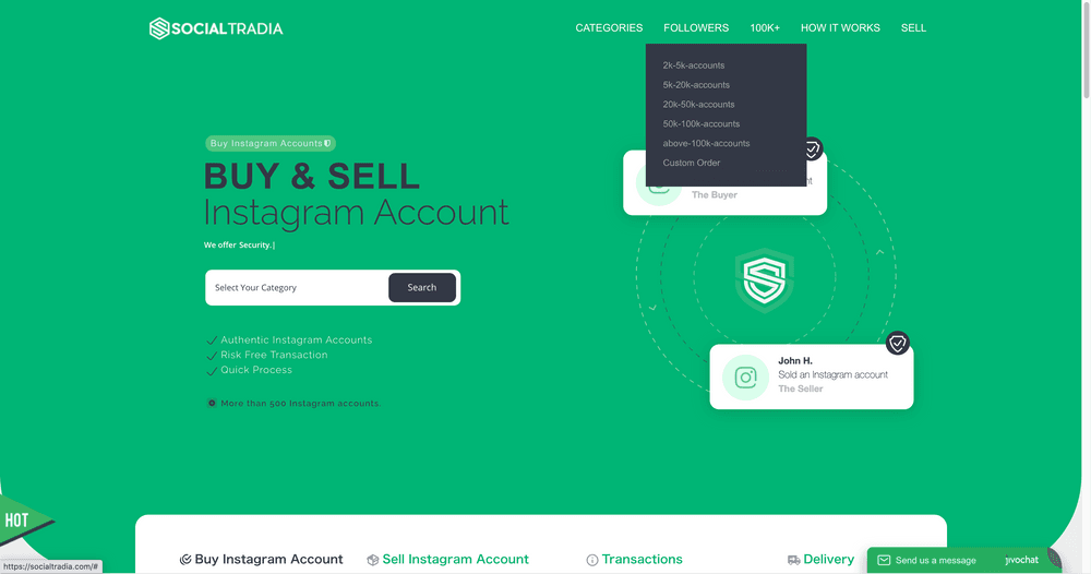 海外のInstagramアカウント売買サイトをのぞいてみましょう。"Sell Instagram accounts"で検索してトップに登場したカナダにあるSocial Tradia(ソーシャル・トレーディア)という会社を参照にしましょう。
