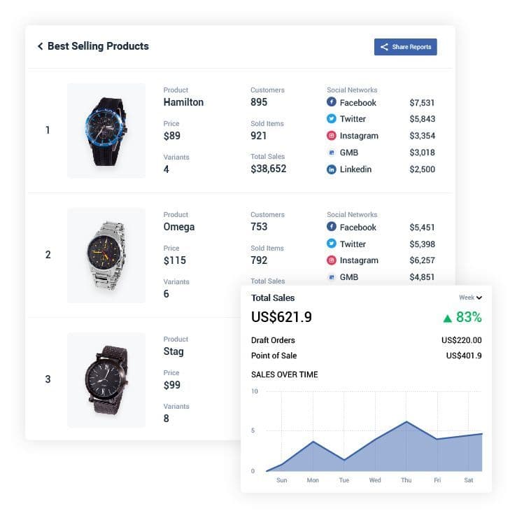 StatusbrewにプラグインされるShopify分析レポートを使用すると、ソーシャルメディアであなたのEコマースストアの可能性を最大限に視覚化できます。 つまり、ソーシャルメディアの指標と販売データを組み合わせると、ソーシャルメディアの取り組みがEコマースビジネスに与える影響の全体像を把握できます。