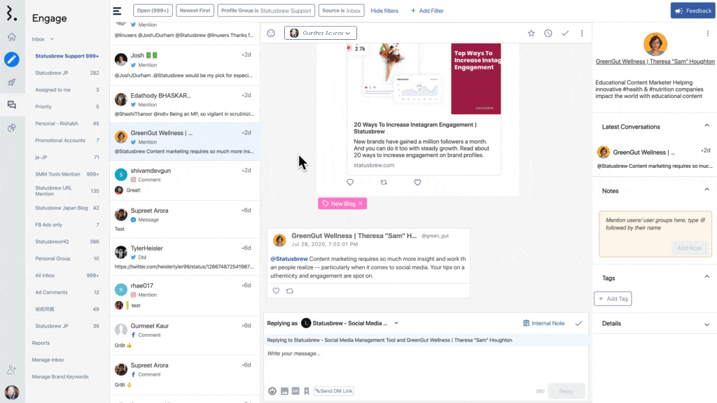 StatusbrewのCRM機能は、すべての顧客データをエンゲージツール内の統一された受信箱に同期します。また、その顧客との過去のコミュニケーションを素早く表示し、会話のコンテキストを追跡することができます。