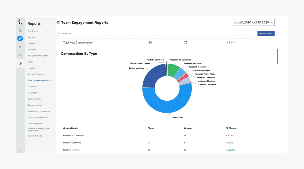 Statusbrewの180以上のレポート指標により、ユーザーはソーシャルメディアでのカスタマーサービスの取り組みの影響を分析することができます。