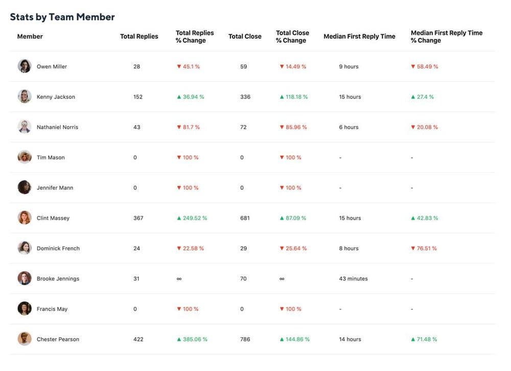 各カスタマーサポート担当者の平均初回応答時間を、チームの平均値と合わせて記録します。