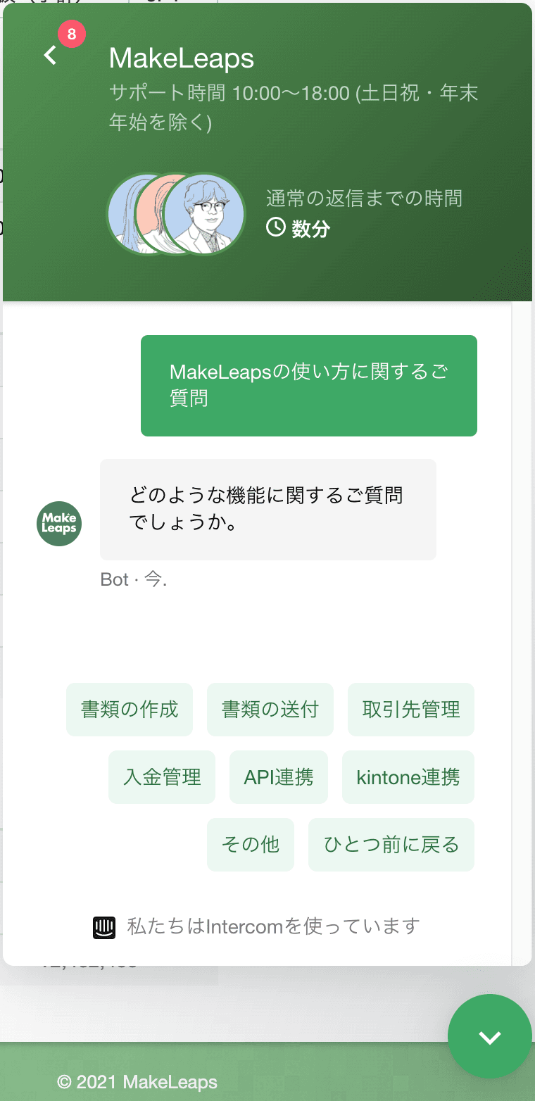 例えばこちらはRICOH社が運営する自動請求書管理ツールMakeLeaps様のカスタマーサポート窓口です。今自分が解決したい、該当する問題を選択していくと最も近い回答が用意されます。