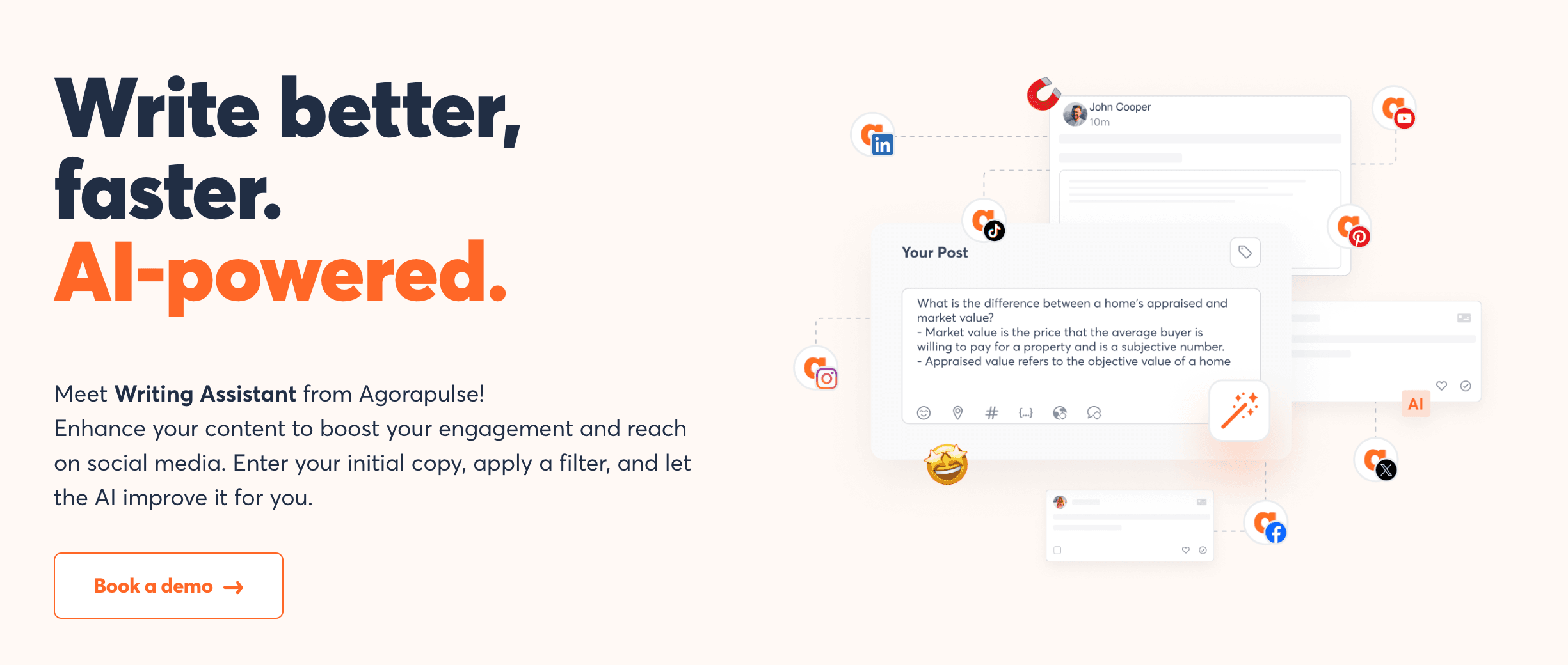 AgorapulseはAIアシストによる投稿キャプションの生成機能などが予約投稿に加わり、さらにマーケティング代理店にとってもクライアントに提案したいコンテンツのブラッシュアップの一助にもなります。