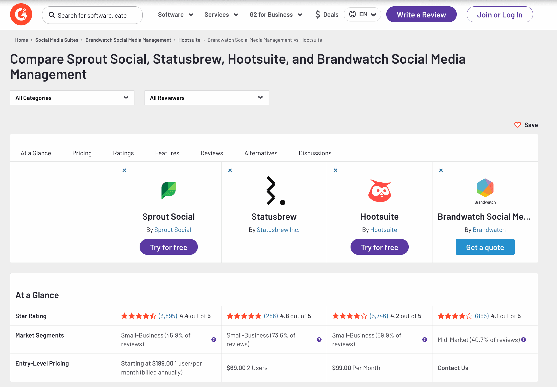 引用:G2 Compare Sprout Social, Statusbrew, Hootsuite, and Brandwatch Social Media Management