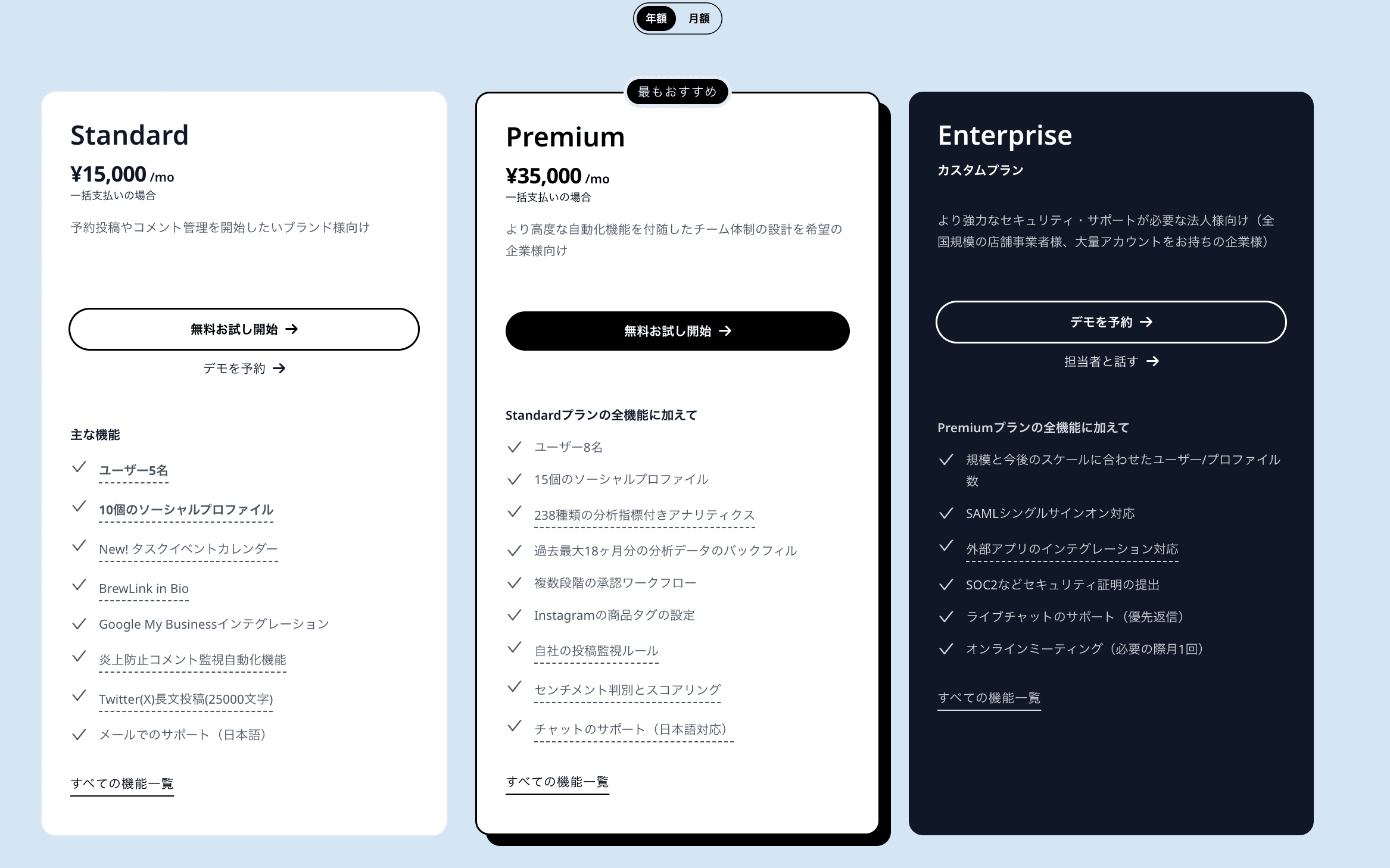 主要なチャネルへの予約投稿〜エンゲージメント管理、分析まで、すべてが揃っています。ただ、ここ近年200%の値上げなどもあいまり、口コミ分析をしたい場合は月額料金 + アドオンとなります。