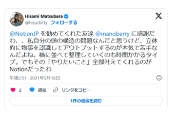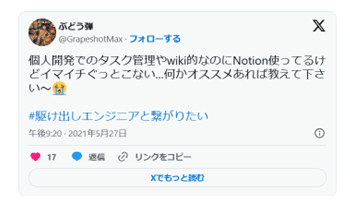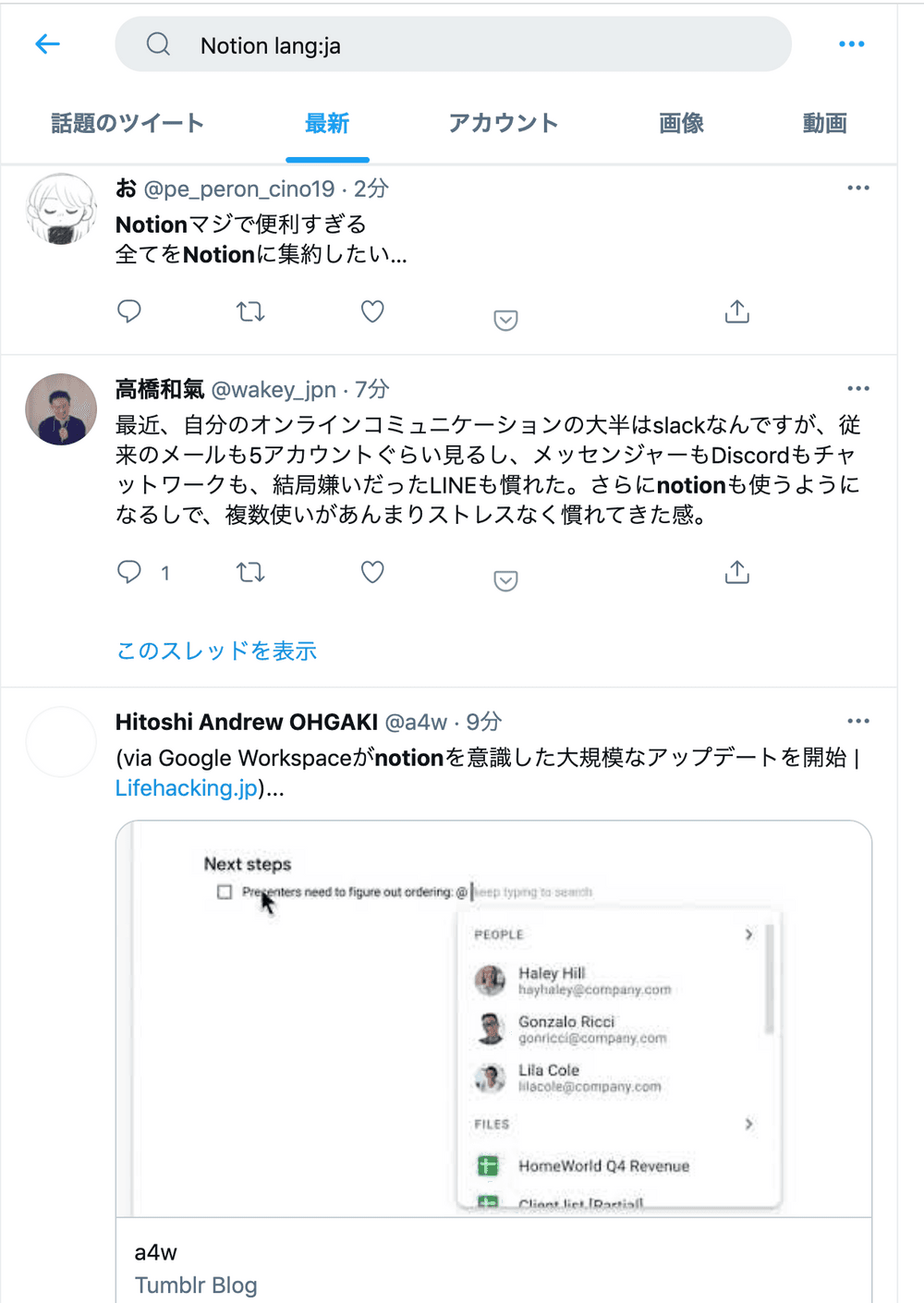 ノートアプリやドキュメント管理、タスク管理に関するツイートを調べるでしょうし、ユースケースに合わせたアプリの利用方法について投稿している人も見つかるかもしれません。