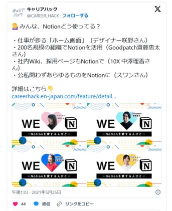 先ほどTwitterでNotionというキーワードを使って検索にかけました。関連性の高い=質の高いキーワードチケットです。