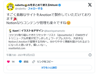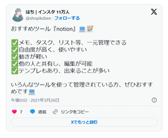 Notionというキーワードを含めたツイートをもっと読み込んでいくと、Notionという多機能ツールは様々な業界の個人が利用しているようです。