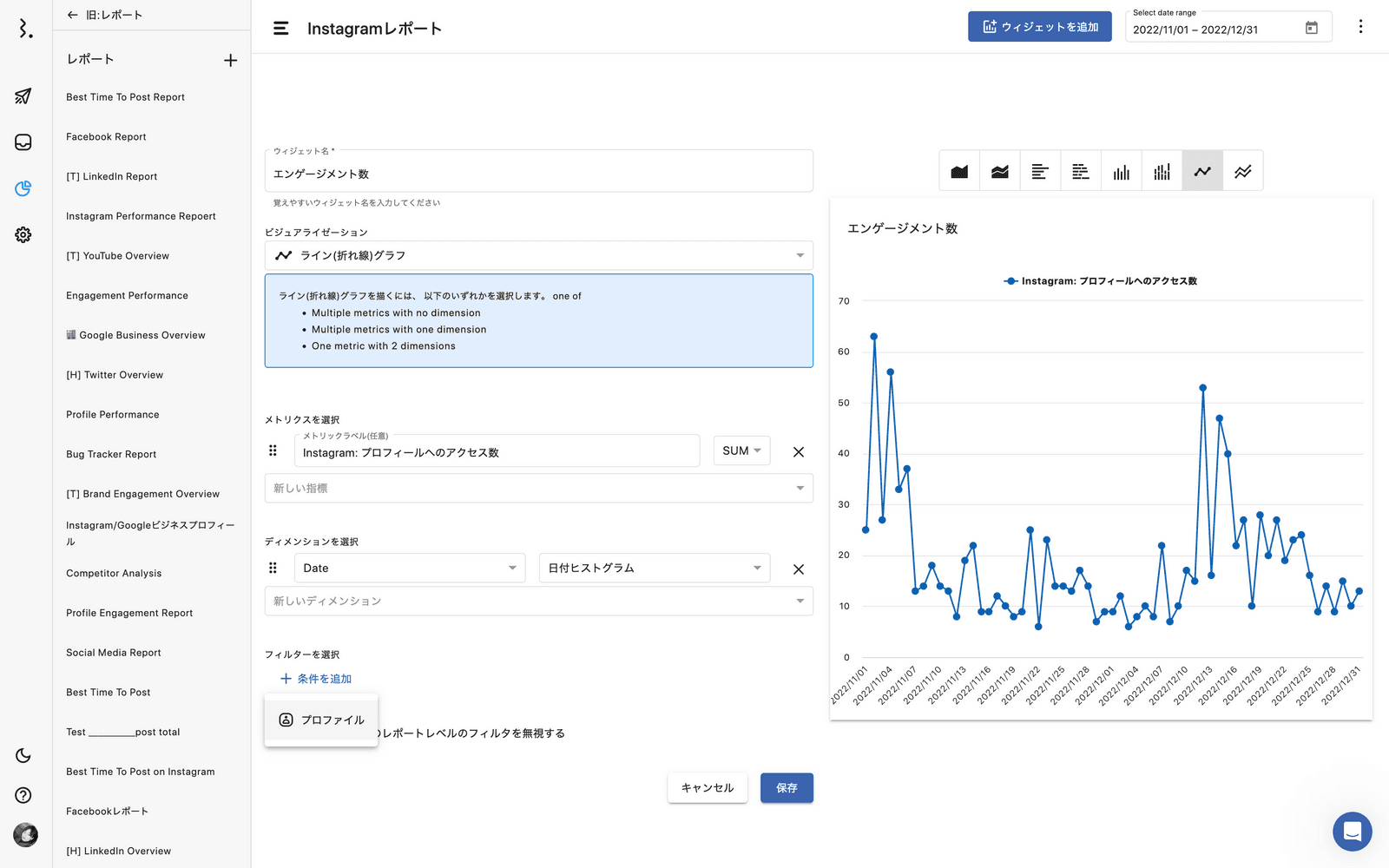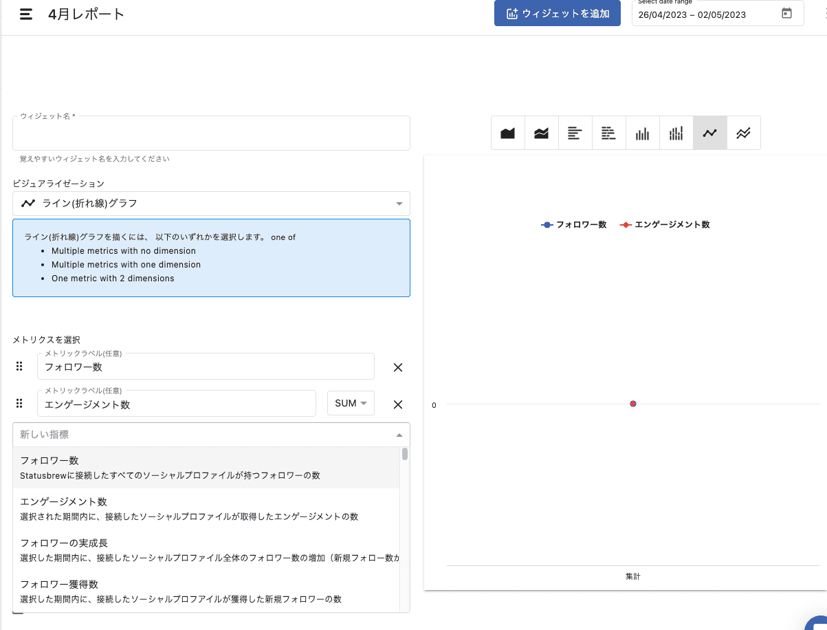 ③レポートに掲示する指標(フォロワー数やエンゲージメント数など)を選択する