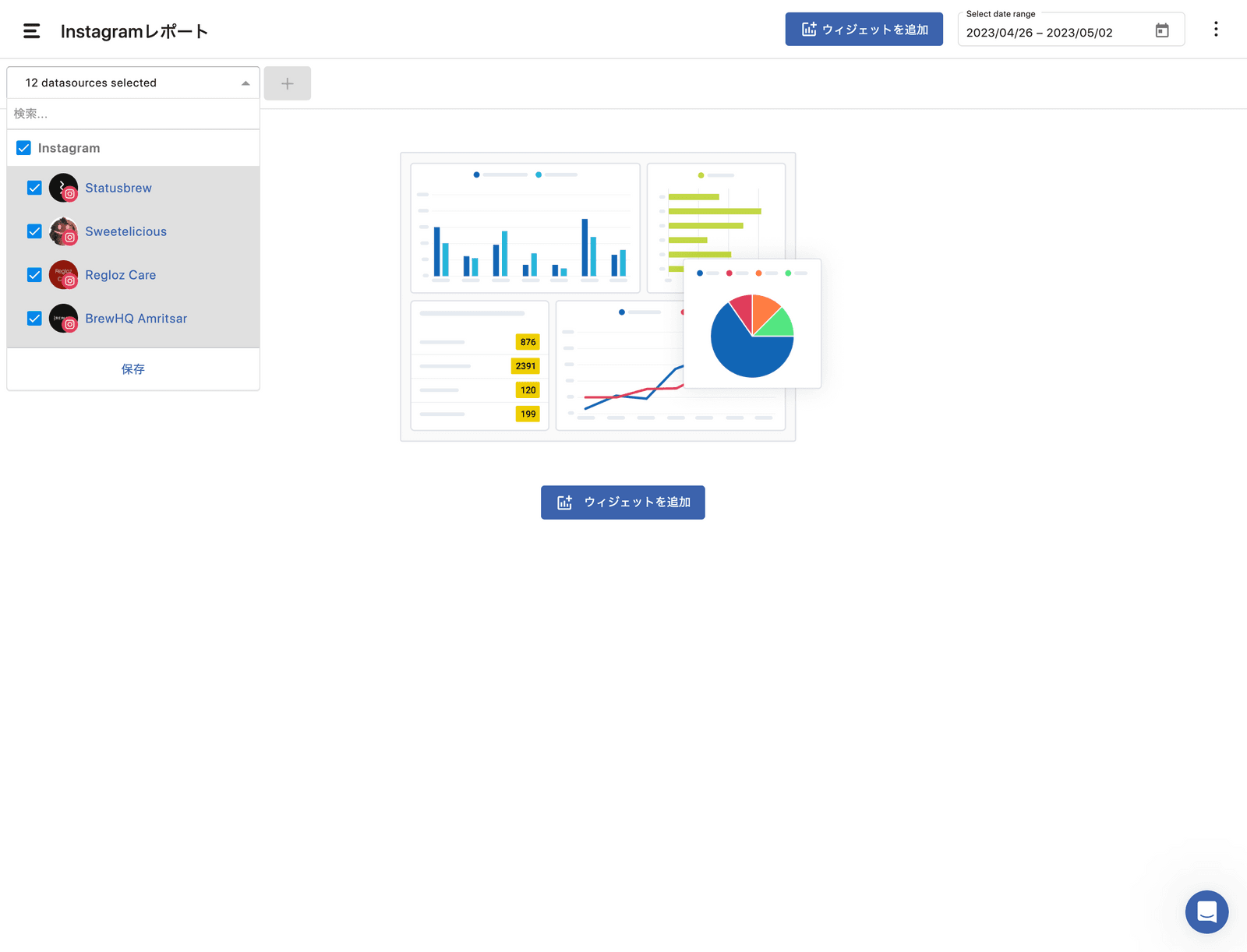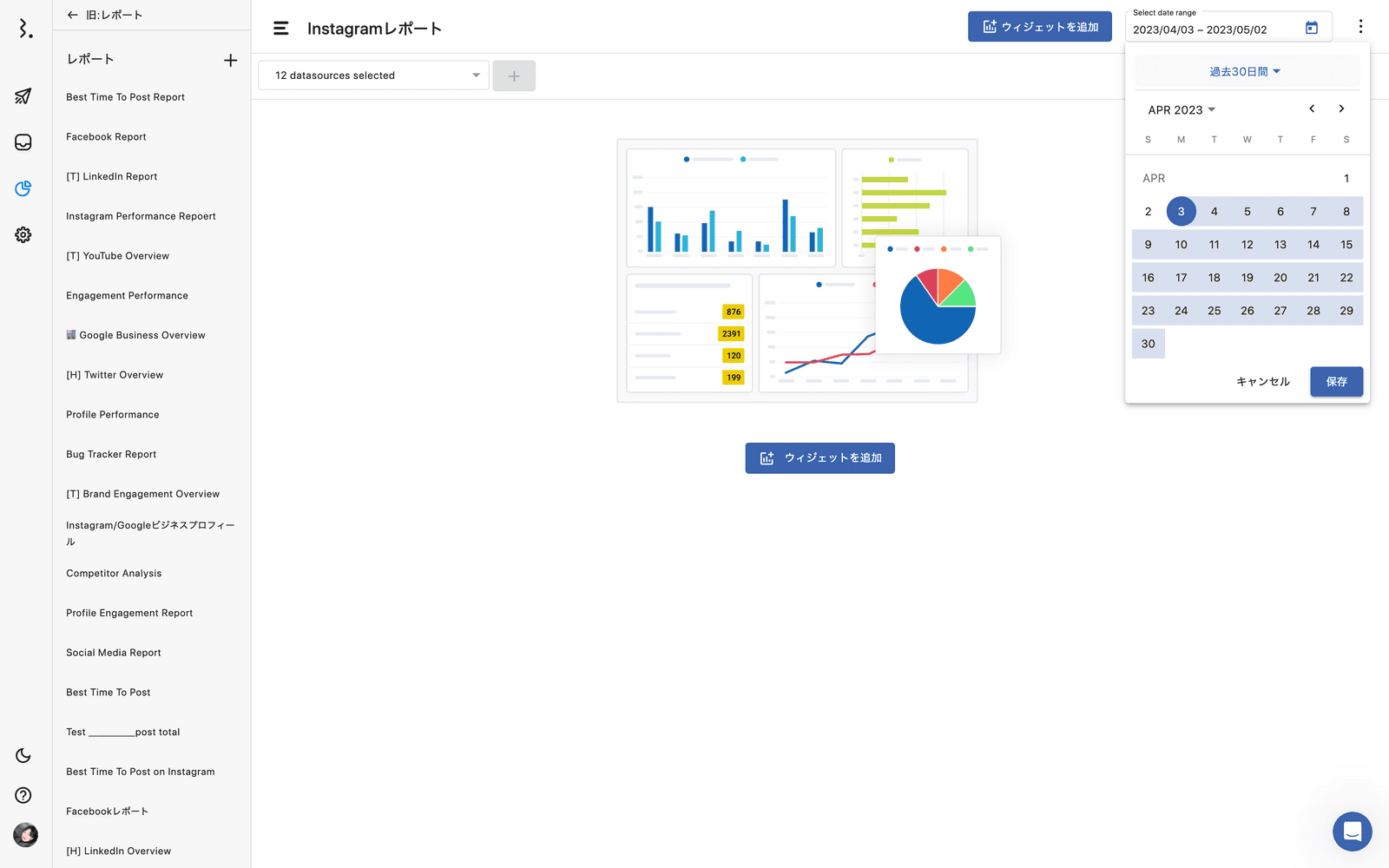 ブランクレポートでは、ウィジェットというデータ単位を作成し、埋めていくことでダッシュボードが完成していく仕様です。ここではデータの取得期間を右上から選択し、