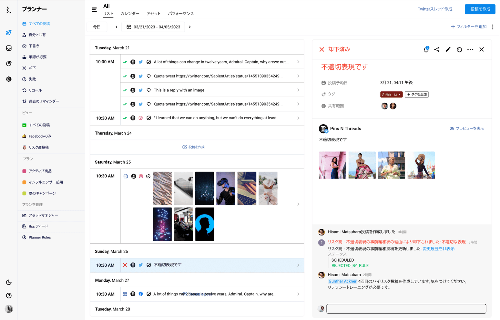 Statusbrewは、外資系ながら最も日本語にアプリケーション、サポートともにローカライズした包括的なソーシャルメディア管理ツールです。ユーザー権限、コンテンツ承認ワークフロー、ルールエンジンなどの機能を提供し、ソーシャルメディアの承認にも使用できます。中でも日本企業様のリクエストをもとに設計した、投稿監視ルールを用いることで、投稿の削除、ミスがあった際の自動却下、承認、タグの追加などのアクションを自動で行うことが可能です。ルールエンジンは非常に自由度が高いため、痒い所に手が届くソーシャルメディア承認ルールを設定する音ができます。