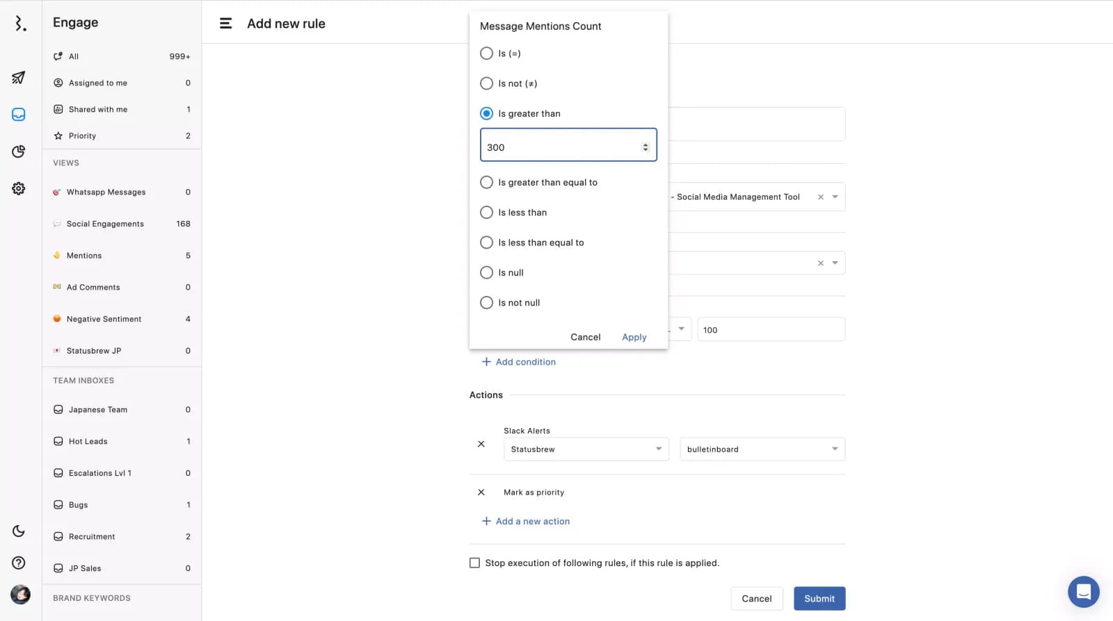Statusbrewでは、コメント監視の「判断を自動化する」ルールエンジンという機能を備えています。