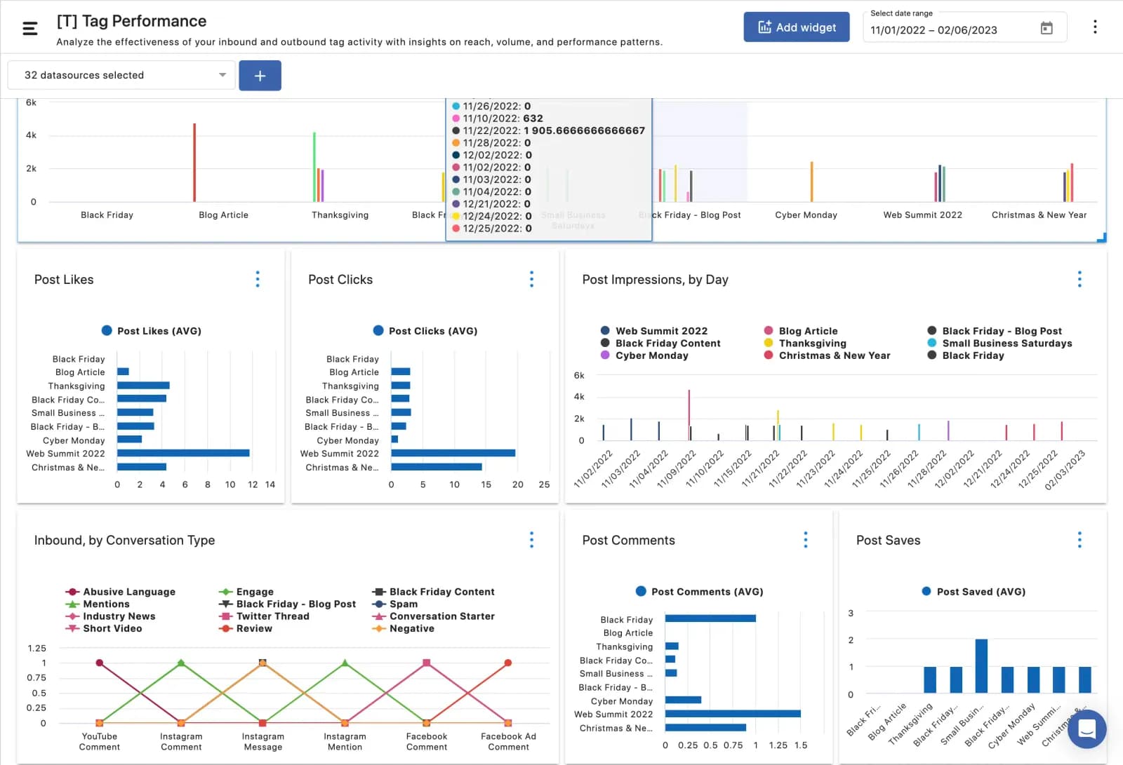 このように、モニタリングしておきたい投稿グループをダッシュボードに敷き詰めておけば、自動的に24時間365日更新されるデータをチェックしておきます。