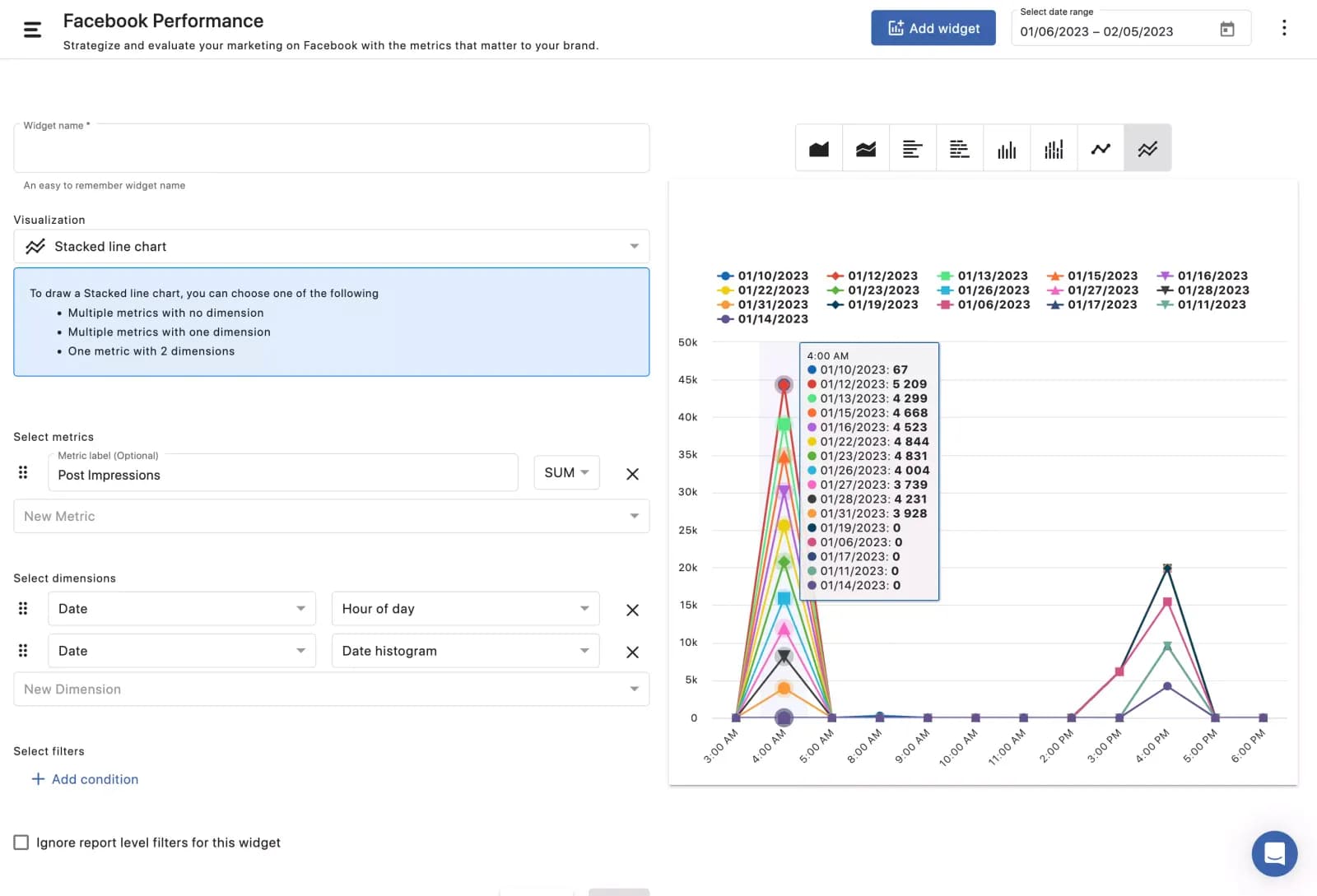 急に時間帯ごと、曜日ごと、毎日の日付でインプレッションが妙に跳ね上がったりしていないか、などをモニタリングするために、データウィジェットを作成します。
