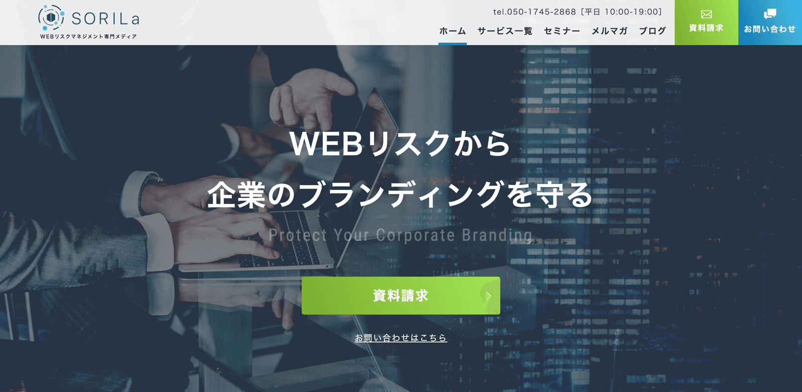 Webリスクソリューションを提供するエフェクチュアルが運営するSORILa(ソリラ)は、企業が抱えるWebリスクの課題解決に役立つ情報を提供するWebリスクマネジメント専門メディアです。SORILaでは、Webリスク診断、誹謗中傷に関する法律知識、誹謗中傷事件の最新動向を踏まえた誹謗中傷対策セミナーなど、様々なサービスを提供している。また、誹謗中傷事件の最新動向に関する情報提供や、誹謗中傷による被害がどの程度なのか分からないという方向けに、無料でWebリスク診断も行っています。大きく分けて二つのサービスがあり、安価で機会による無人監視のMimamornと、有人の投稿監視サービスのオンライン評判管理対策があります。オンライン評判管理対策は、コンサルティングサービスから、逆SEO、ネガティブキーワード対策、検索エンジン上のネガティブ情報の検知・記録・通知などを行います。