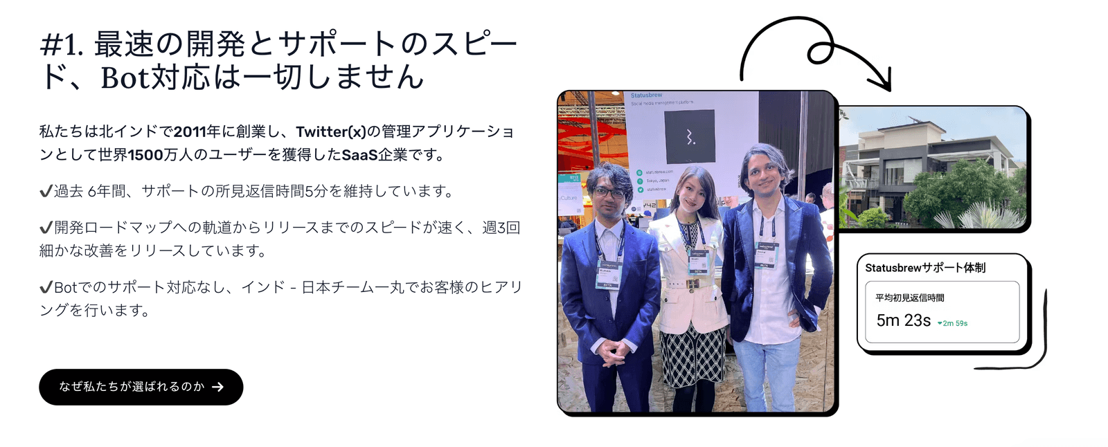 Statusbrewは日本チームがあり、さらに過去6年間のサポートの所見返信時間平均5分をキープしています。
