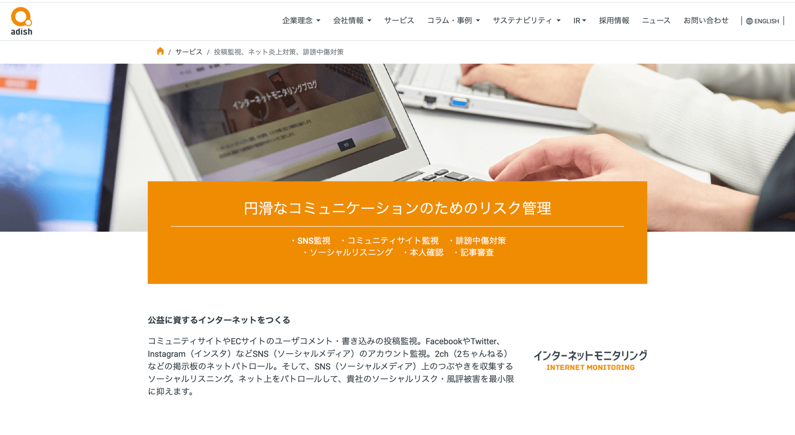 アディッシュは、ソーシャルメディアやウェブプラットフォームの投稿監視など、インターネット監視サービスを提供しています。特に、ソーシャルメディアの監視、SNS監視、およびその他のネット監視に特化しています。「円滑なコミュニケーションのためのリスク管理」というスローガンをインターネットモニタリング事業のモットーにしています。