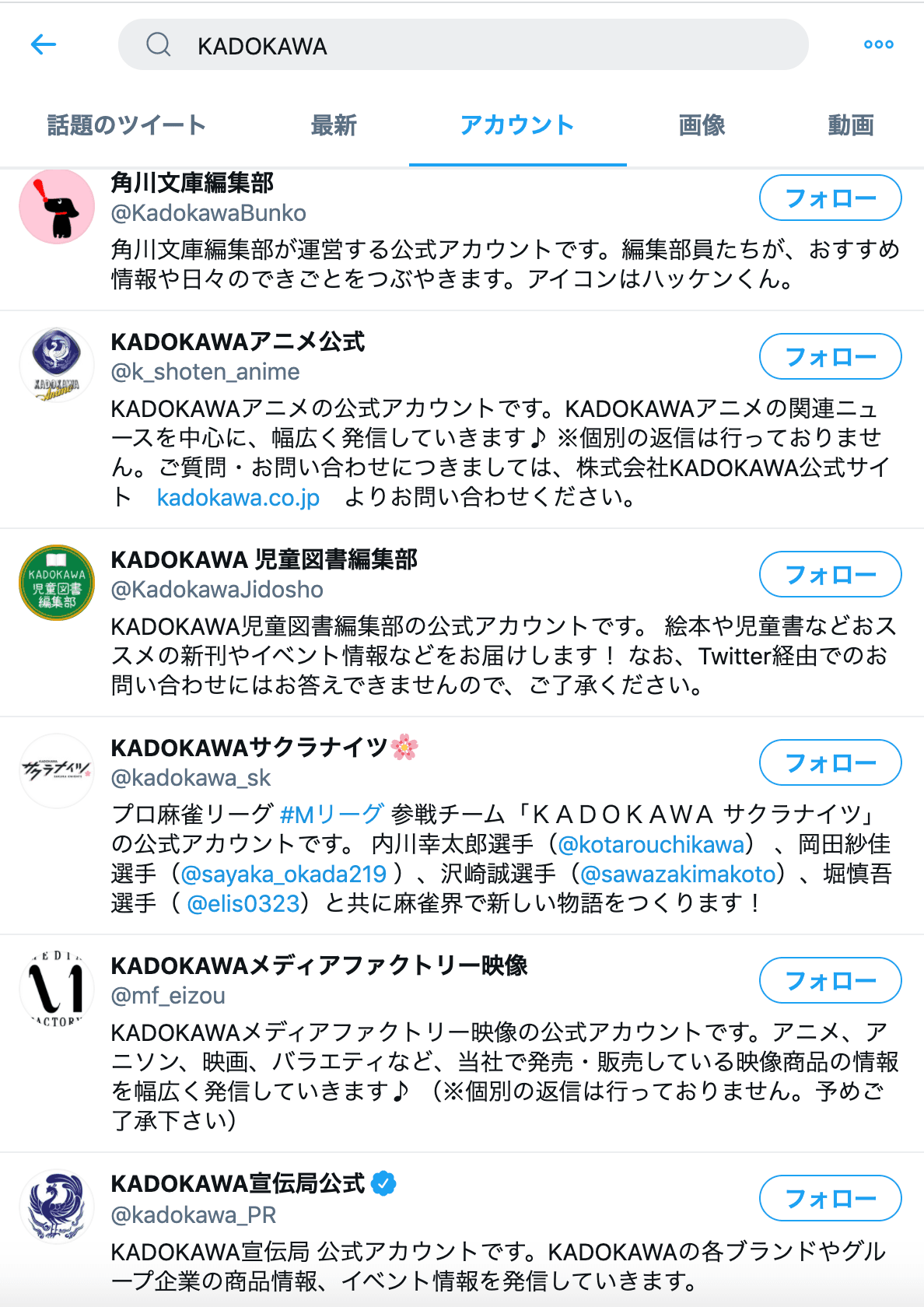 例えば出版社の角川は全ての事業、編集部ごとに公式TwitterとFacebookを運営しています。