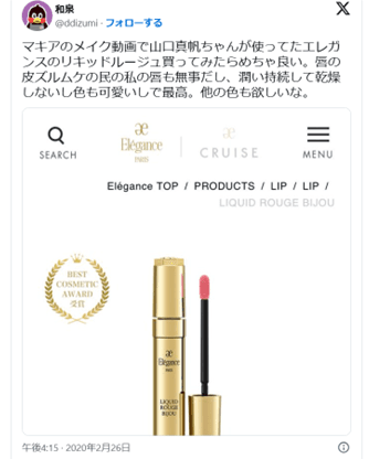 マキアはTwitter、Instagram、Pinterest、LINE、そしてYouTubeなどほぼ全てのソーシャルチャネルを使って美容品・化粧品のプロモーションをしていますが、知名度もソーシャル上で非常に高くこのように多くのユーザーがマキアのコンテンツにより影響されて購買にまで結びつけています。