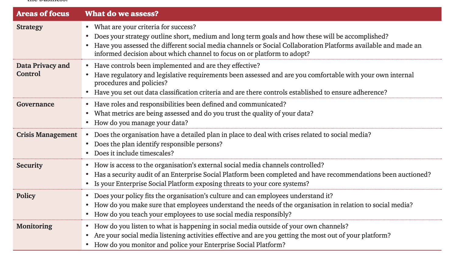 これには、ソーシャルメディアが組織にもたらすリスクを理解し、管理することが含まれます。炎上リスク、コンプライアンスリスク、セキュリティリスクなどはどのように管理しますか?