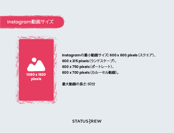 Instagram動画(リール)最小サイズ: 600 x 600 pixels (スクエア)、600 x 315 pixels(ランドスケープ、600 x 750 pixels(ポートレート)、600 x 700 pixels(カルーセル動画)
