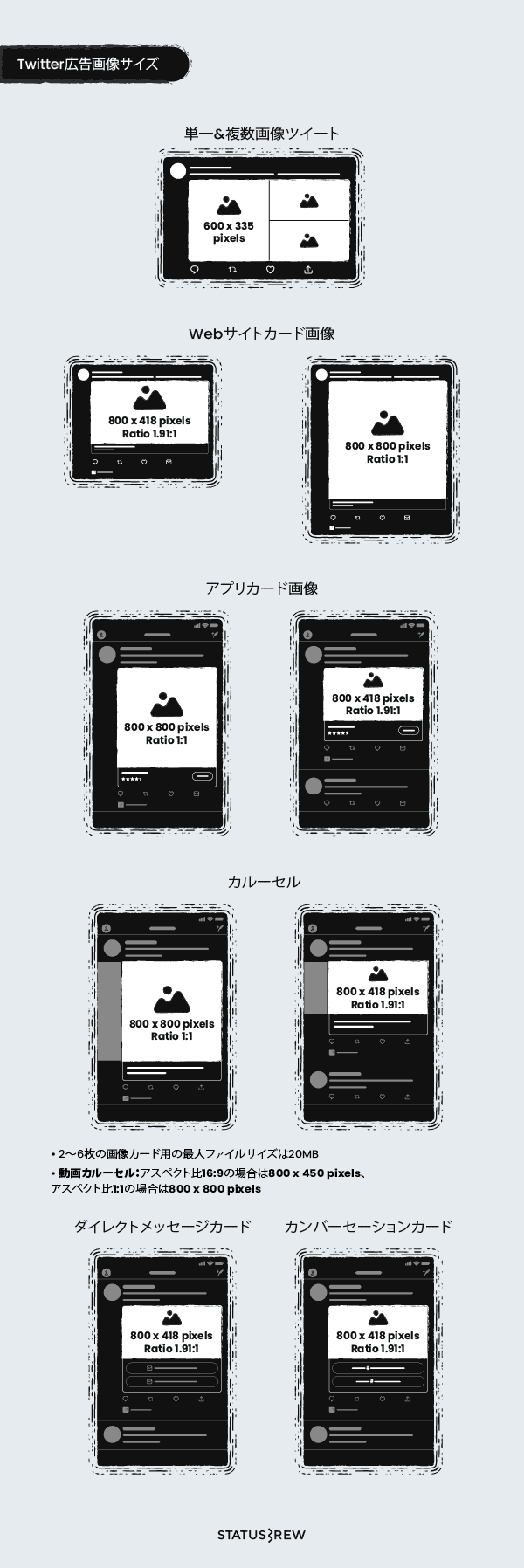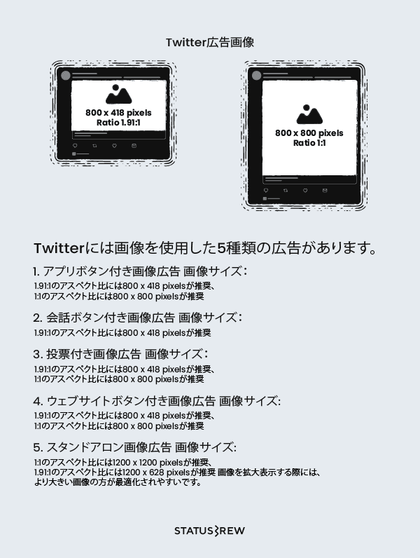Twitterの画像広告は基本的に800 x 418pixelsです。アプリダウンロードを目的とした画像広告、カンバーセーションボタン付き広告、Twitter投票付き広告、ウェブサイト誘導広告は800 x 418 pixelsでスタンドアロン広告のみ1200 x 1200 pixels推奨です。