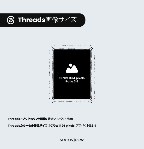 最大表示サイズ 1070 x 1424 Pixels:Threadsで表示される画像の最大サイズは、幅1070 pixels、高さ1424 pixelsです。このサイズは3:4のアスペクト比に従います。 大きなサイズの投稿 これらの寸法より大きな画像を投稿することは可能ですが、高さが1424 pixelsを超えないように自動的にリサイズされます。このリサイズはiPhoneアプリからの測定に基づいています。