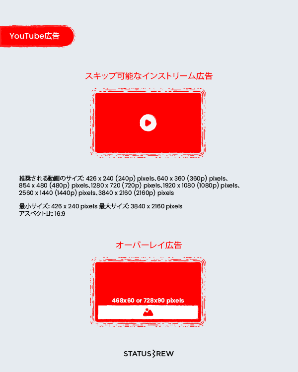 YouTubeスキップ可能なインストリーム広告動画ディメンション: 426 x 240 pixels、640 x 360 pixels、854 x 480 pixels、1280 x 720 pixels、1920 x 1080 pixels、2560 x 1440 pixelsもしくは3840 x 2160 pixels