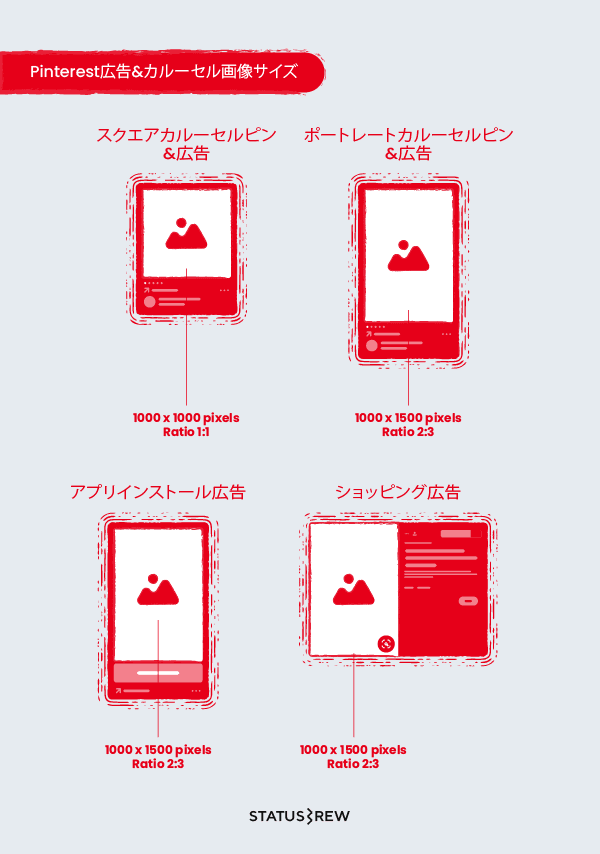 Pinterestスクエアカルーセルピン&広告: 1000 x 1000 pixels アスペクト比1:1