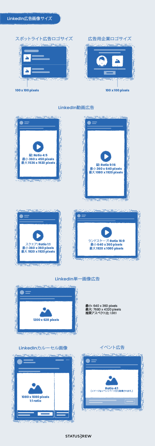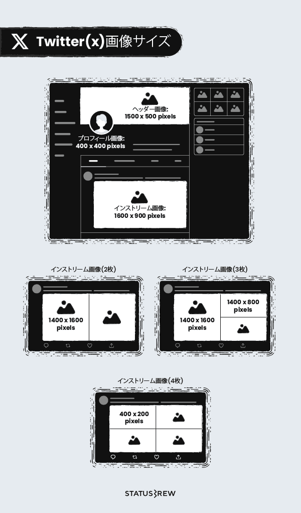 StatusbrewがTwitter、Facebook、Instagram、TikTok、LinkedIn、Pinterest、Snapchat、YouTube、Tumbler、そのほかソーシャルネットワークを含むすべてのソーシャルメディアプラットフォームの投稿(広告も含む)、カバー写真、動画用のソーシャル メディア画像サイズを2024年最新版としてガイドします。どこよりも詳しいサイズ表を是非ご参照ください!
