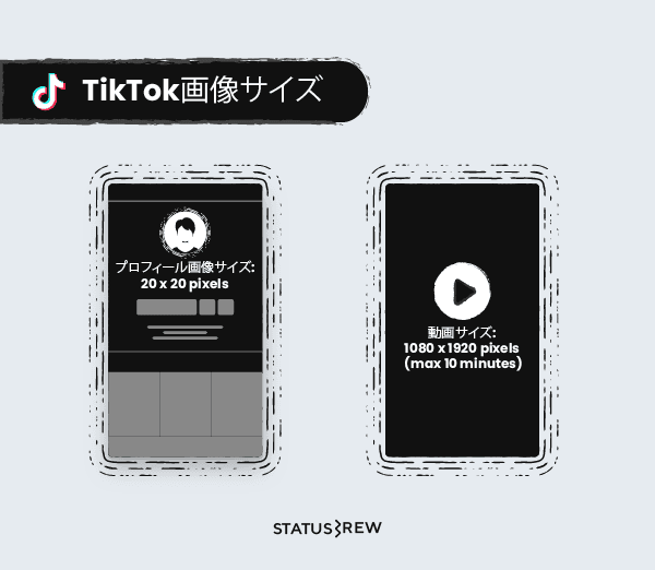 ポートレート:720 x 1280 pixels ランドスケープ:1280 x 720 pixels スクエア:640 x 640 pixels 推奨されるTikTok画像サイズ TikTokプロフィール写真サイズ:20 x 20 px(最小)、JPG、PNG TikTok動画サイズ:1080 x 1920、最大10分 TikTokインフィード広告ビデオアスペクト比:9:16、1:1、または16:9 TikTokビデオ広告サイズ:720 x 1280 px、640 x 640 px、1280 x 720 px