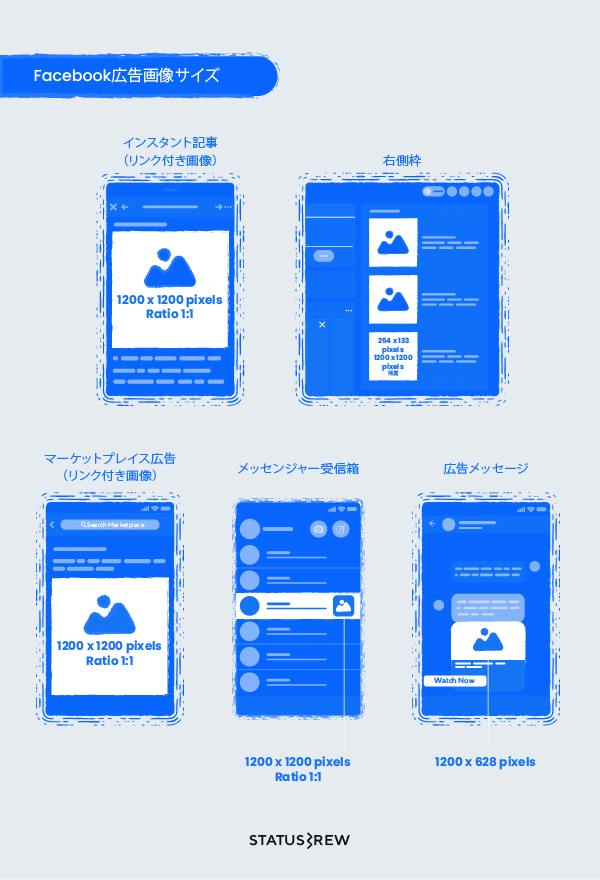 Facebookマーケットプレイス広告: 1200 x 1200 pixels アスペクト比1:1