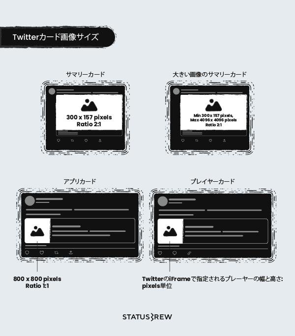 TwitterにURLを挿入した際のカード画像のサイズも調整することを推奨します。Twitterカードには大きく分けて4種類存在します。