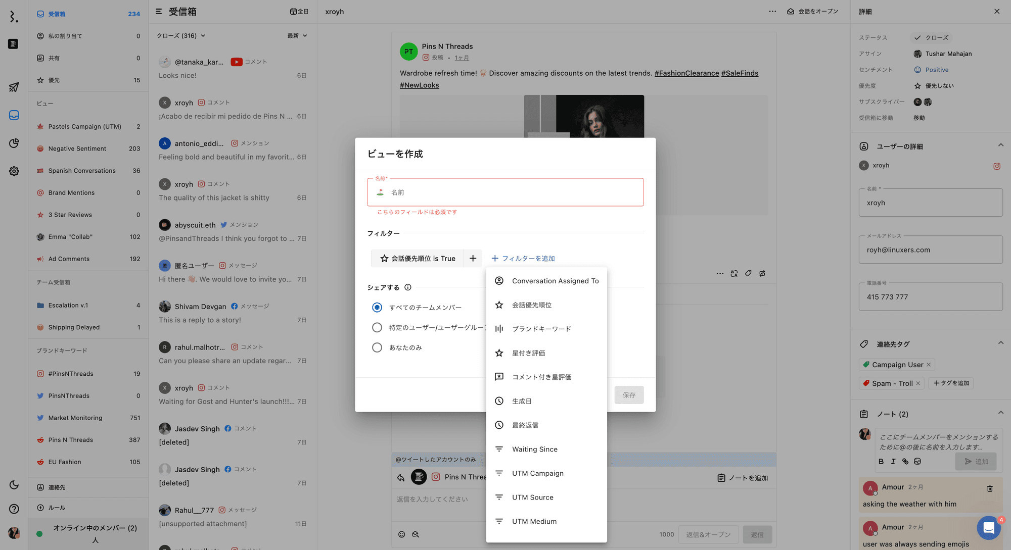 ・会話のタイプ(例:Facebookメッセンジャー、TwitterDM、Instagramメンション、リスニングキーワード) ・言語(例:日本語、英語、フランス語) ・ソーシャルプロファイル ・アサイン(担当者) ・リスニングキーワード ・返信担当者 ・チーム受信箱 ・タグ ・投稿タグ ・星付きコメント ・星評価 ・重要度 ・センチメント(例:ネガティブ、ポジティブ、ニュートラル) ・ソース ・会話チケット発生日 ・会話チケット最終更新日 ・返信の待ち時間 ・UTM Campaign ・UTM Medium ・UTM Source ・UTM Content ・UTM Term