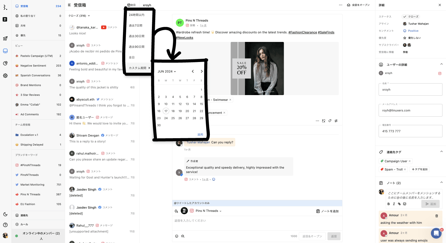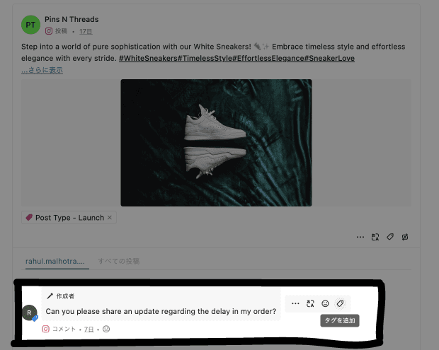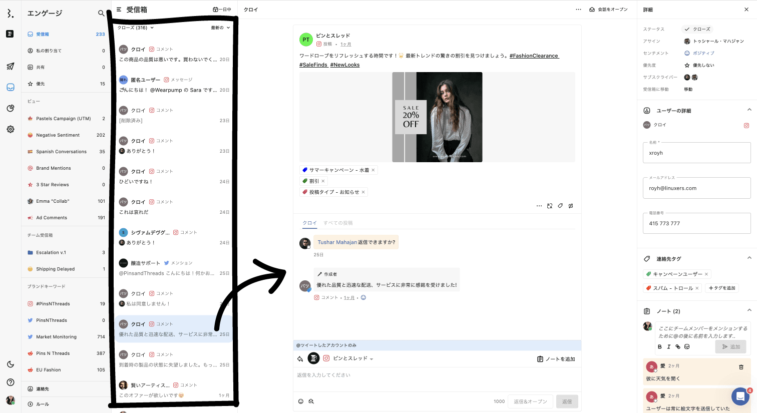 また、タグ付けされたユーザーは、その後受信するすべてのメッセージにも同じタグが付けられます。例えば「インフルエンサー候補」や「クレーム」など。現在のクライアントや影響力のあるユーザー、またはスパムや不正行為ユーザーを素早く見つけ、適切な対応を行うことができます。