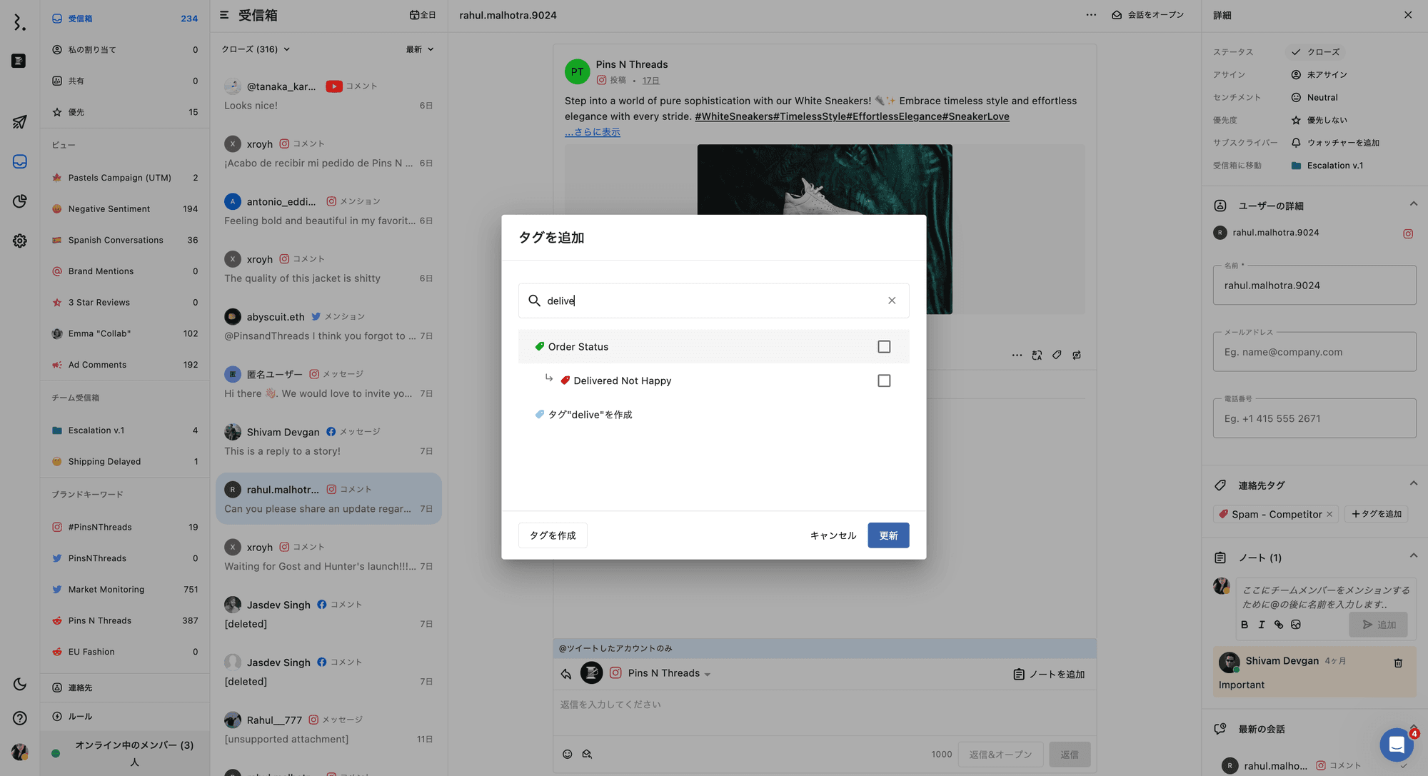 このチケットを「クレーム - 配送遅延」と特定するためのタグを、検索して付与します。