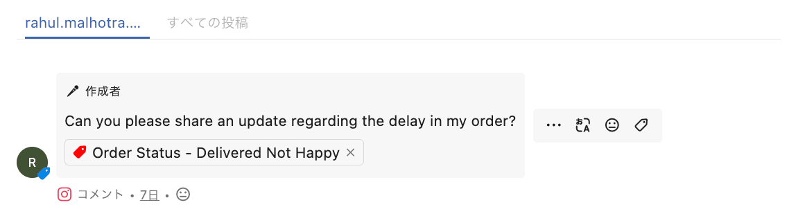メッセージの種類 (Instagramのコメントやツイート、YouTubeコメント)に応じて、次のようなアクションを実行できます。